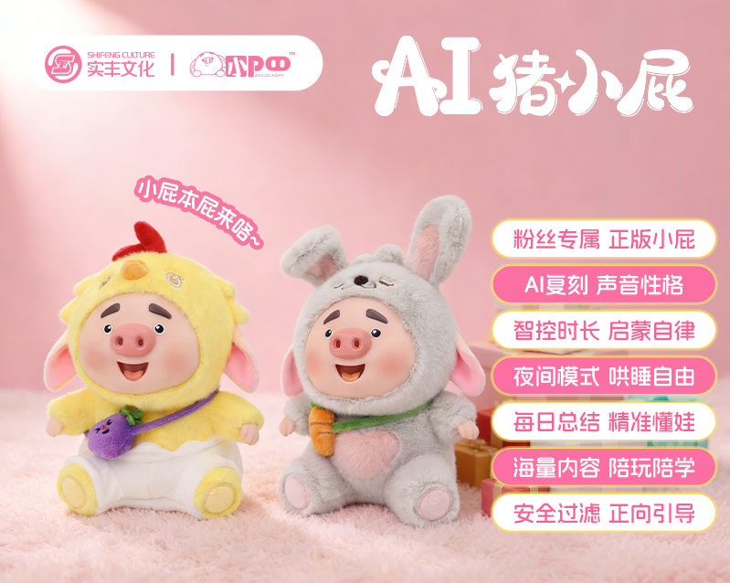 深耕玩具与潮玩领域多年的实丰文化,携手百度智能云推出AI小度熊马年限定款产品,基于国民IP打造的“AI猪小屁”智能毛绒玩具,还原原版人设与声音,兼具亲子互动和早教功能。该品牌还在合肥落地AI玩具研发中心,构建Multi-Agent平台,实现云-边-端协同交互,驱动产品全域迭代升级。