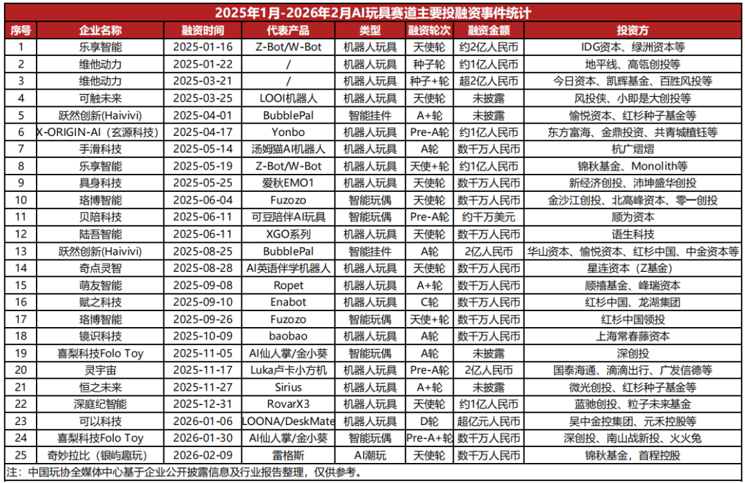 根据中国玩协统计,自2025年1月至2026年2月,资本市场中AI玩具相关投融资事件至少发生25宗,参与投资机构近百家。